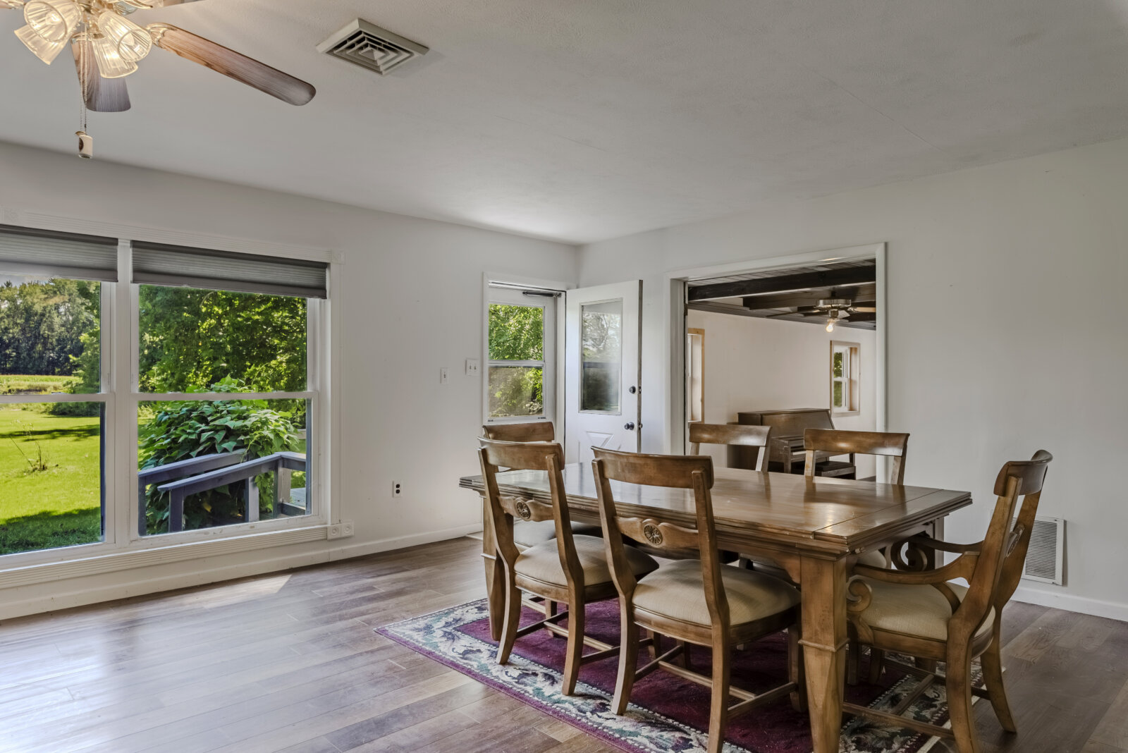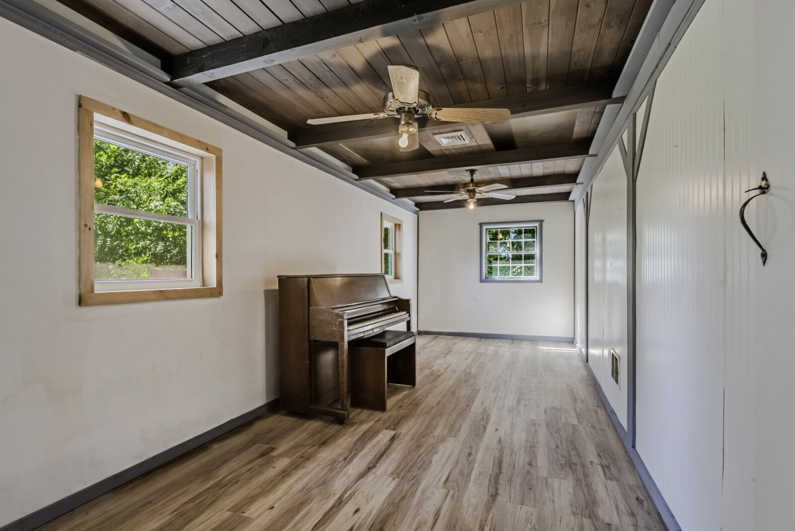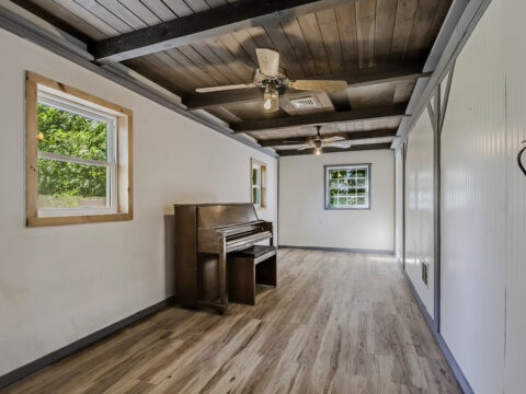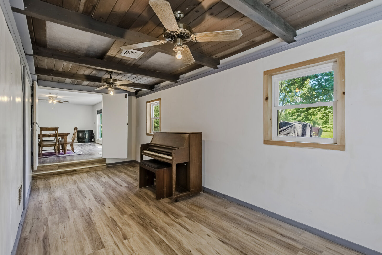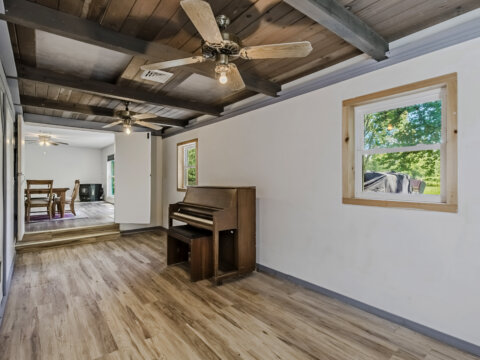The bonus room with exposed wood ceiling beams and ceiling fans offers serious versatility—convert it into a third bedroom, home office, or music room (hello, upright piano!) with ease.